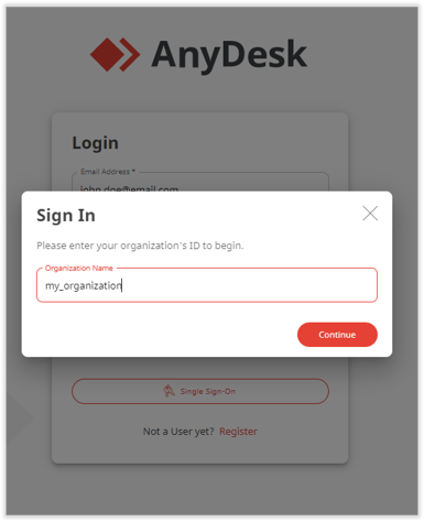 - En el campo Nombre de la organización, ingresa el ID de la organización que recibiste por correo electrónico y haz clic en Continuar.